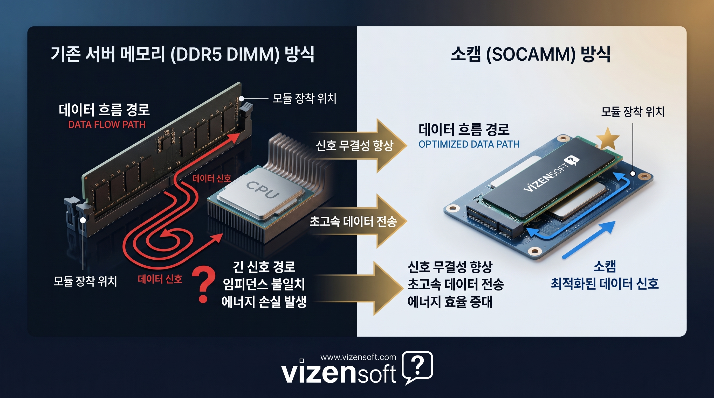 기존 서버 메모리(DDR5 기반 DIMM)는 기판에 직접 부착되는 구조로, 확장성과 전력 효율 면에서 한계가 명확했다. 소캠은 이 문제를 해결하기 위해 스마트폰용 저전력 D램(LPDDR) 기술을 서버 환경에 이식한 새로운 모듈 구조다.
