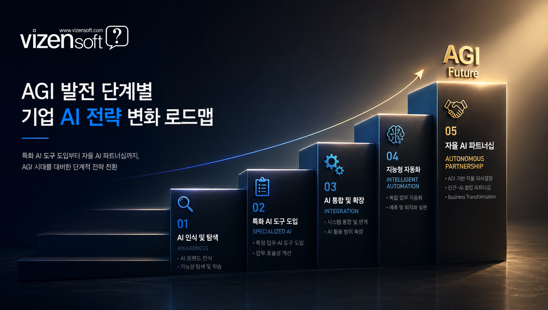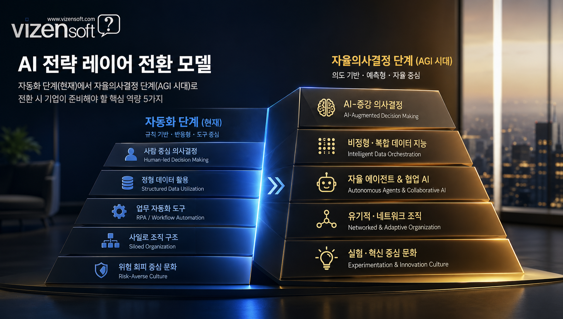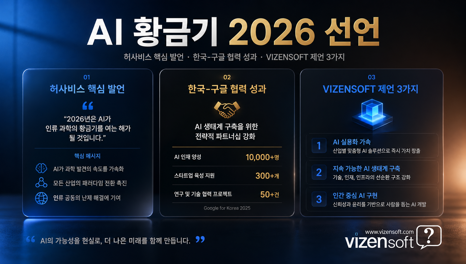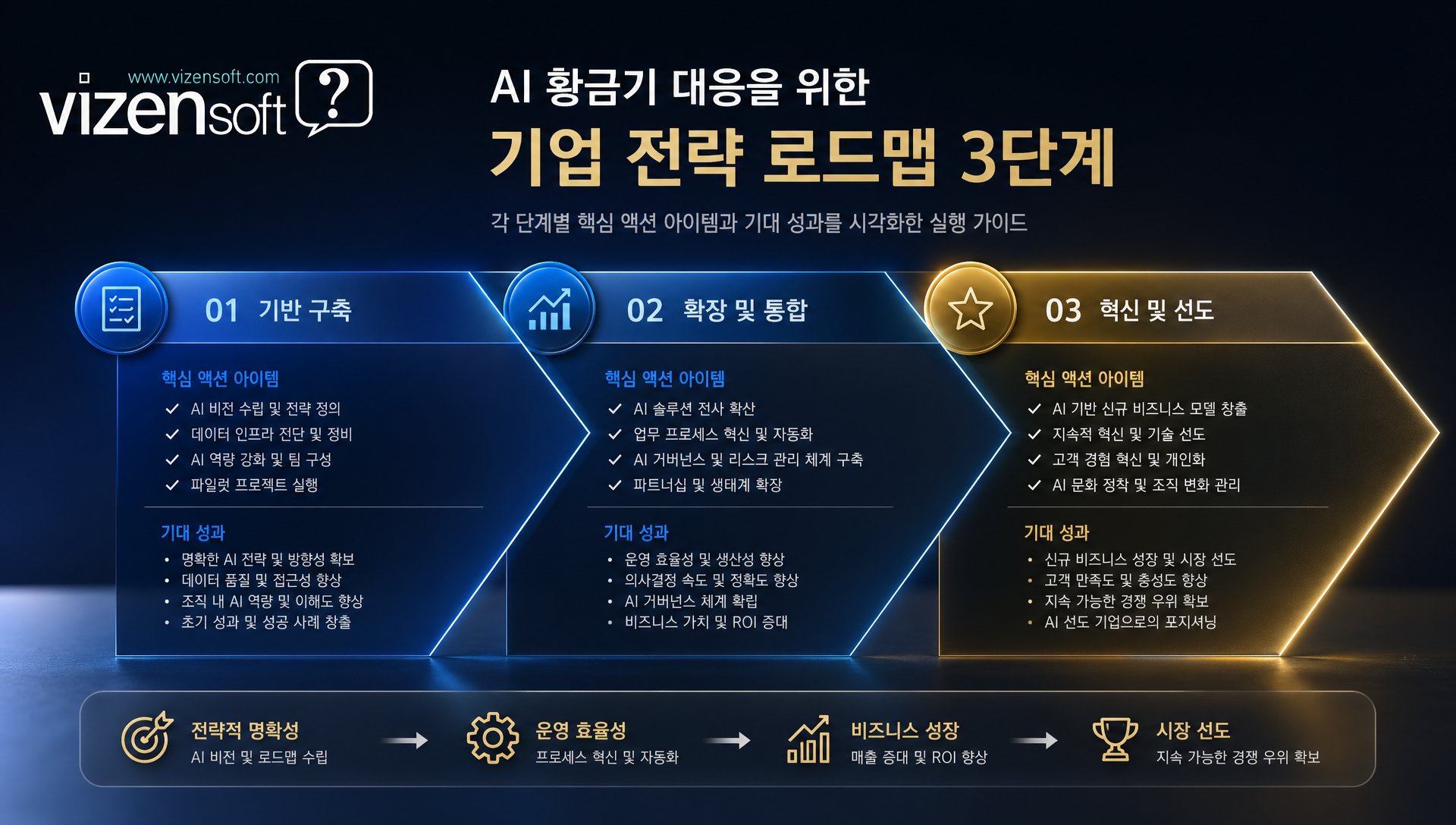 AI 황금기는 저절로 오는 선물이 아니다. 준비한 자에게만 황금기이고, 준비하지 못한 자에게는 도태의 시기다. vizensoft는 다음 세 가지를 핵심 제언으로 제시한다.