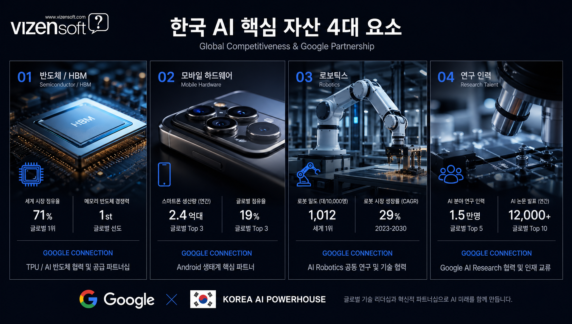 구글이 한국을 선택한 이유는 단순히 시장 규모 때문이 아니다. 허사비스 CEO 스스로 언급했듯, 반도체(SK하이닉스의 HBM), 모바일 하드웨어, 로보틱스, 세계 수준의 연구 인력이라는 4가지 핵심 자산이 동시에 존재하는 나라는 전 세계적으로 극히 드물다.