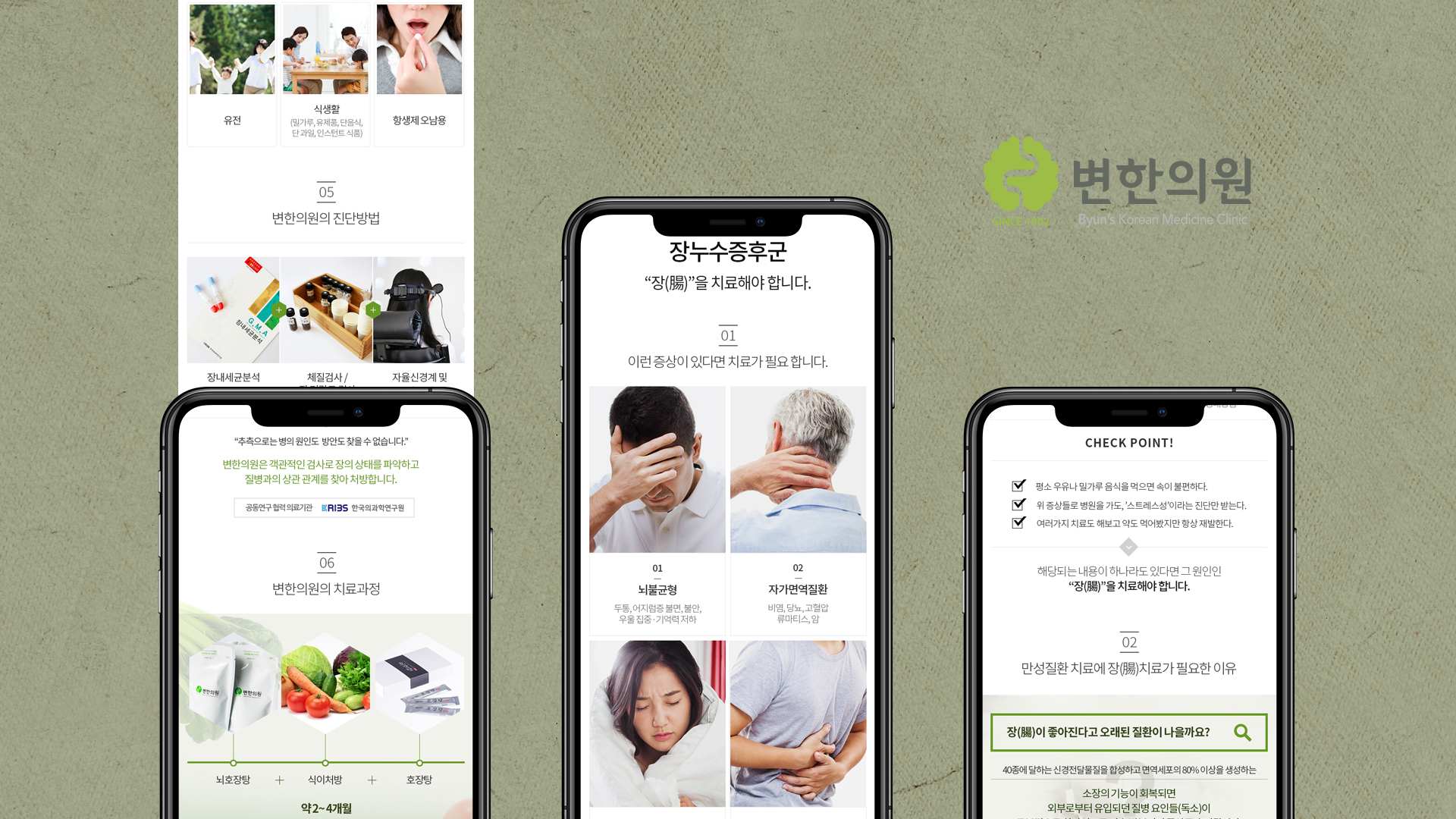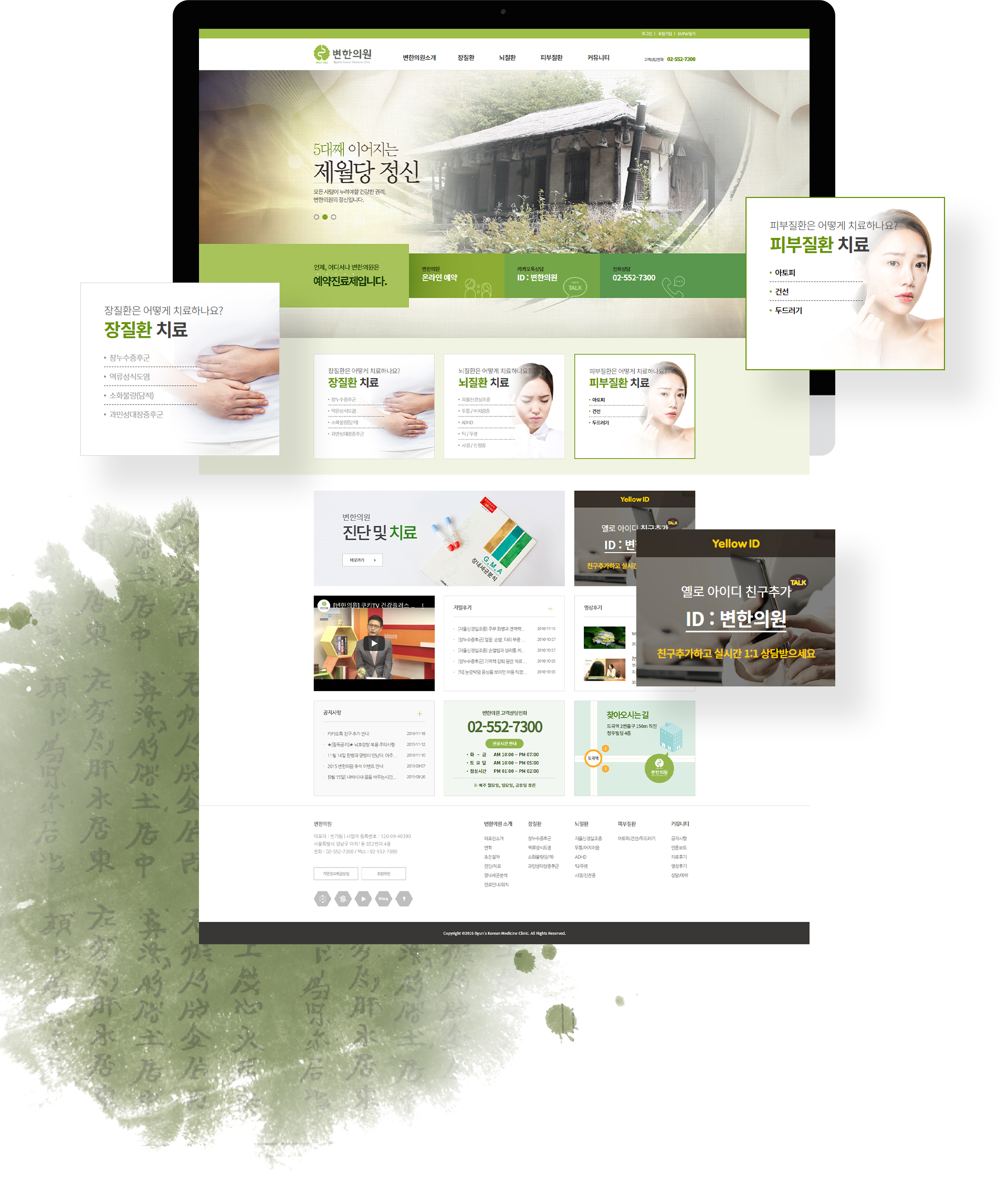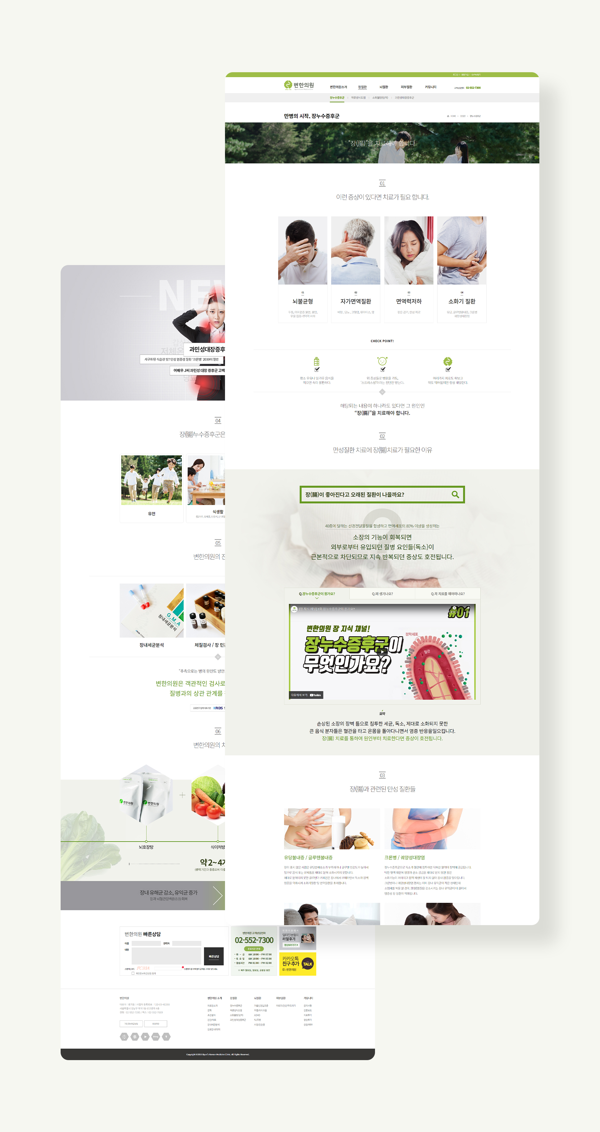 변한의원의 CI컬러를 홈페이지요소 곳곳에 활용하여 전반적으로 통일성을 부여하고,