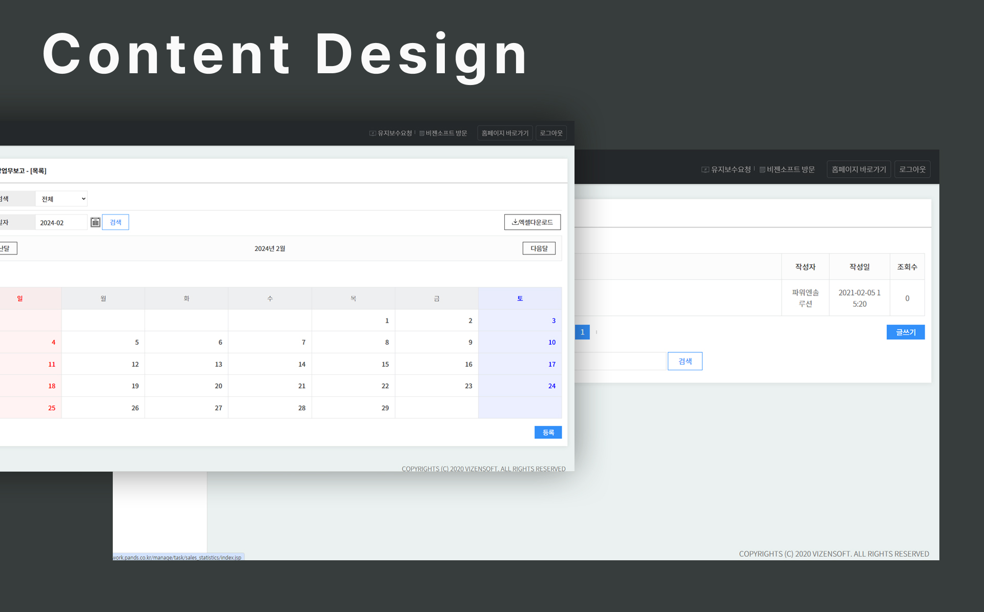 표 기반의 콘텐츠 배치로 가독성과 실무 집중도를 고려한 관리자 맞춤형 시스템 UI.