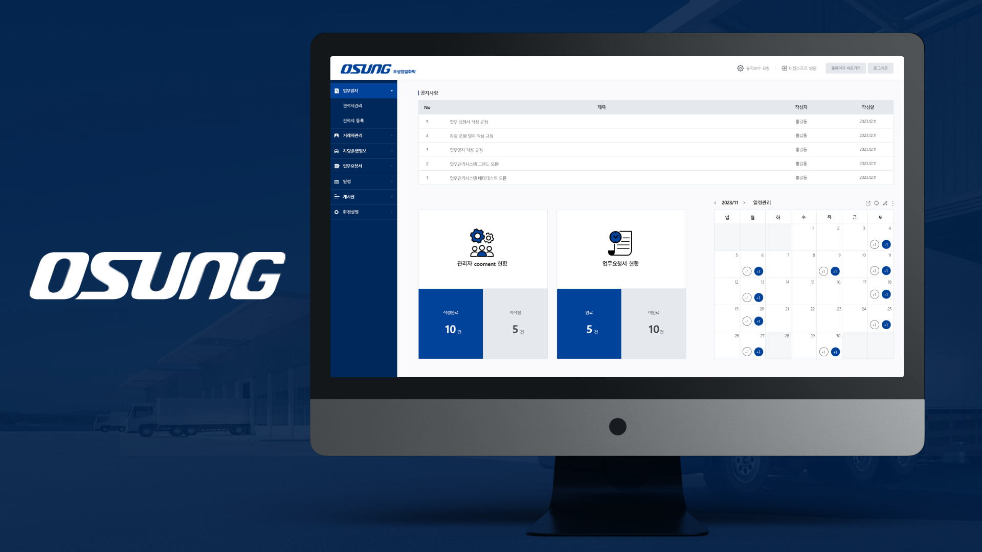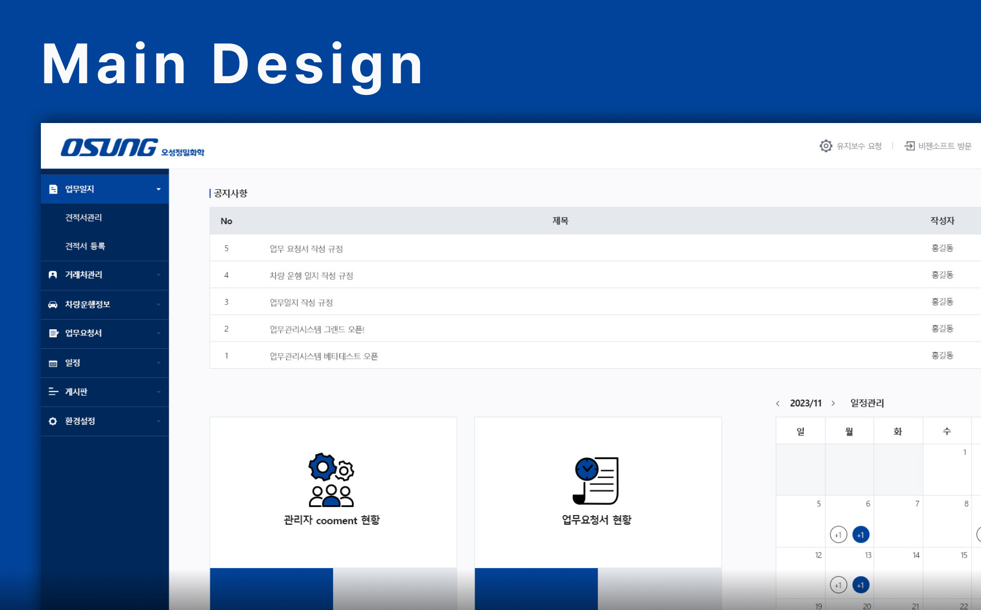 공지, 문서, 일정, 거래처 등 사내 전반의 업무를 한눈에 관리할 수 있도록 구성된 내부 전용 플랫폼.