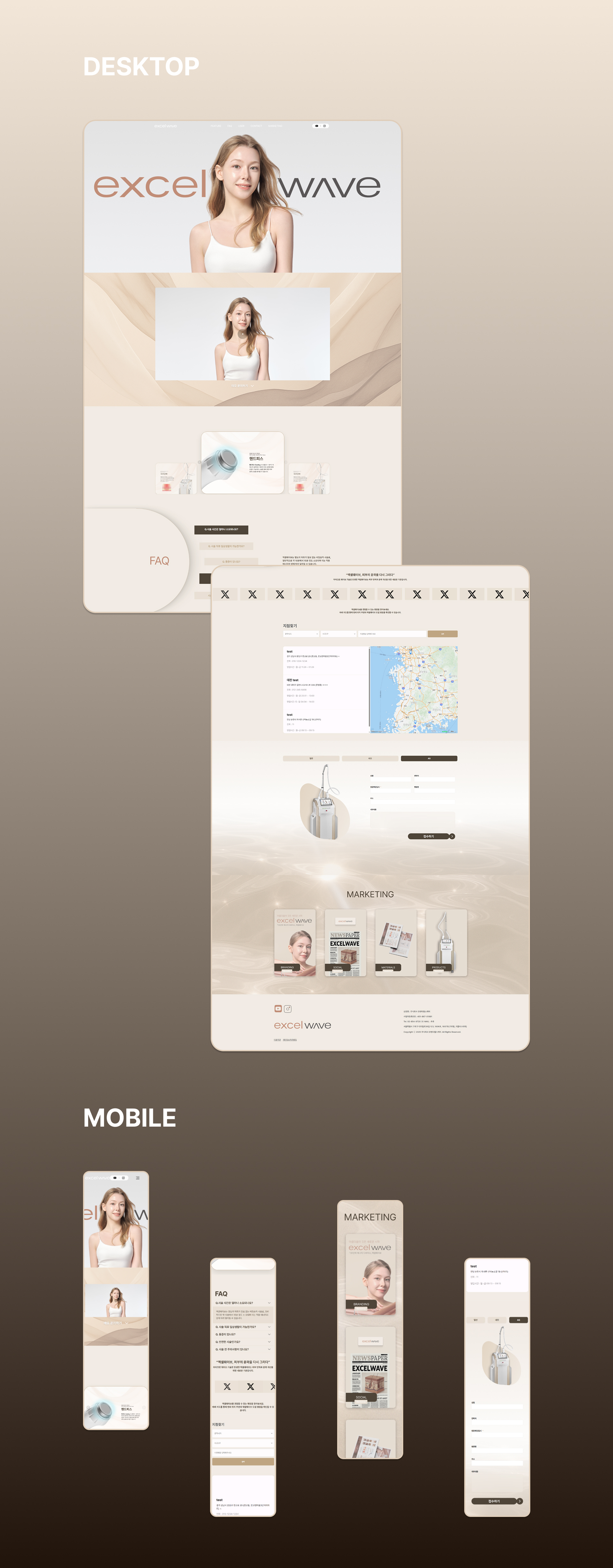 곡선과 베이지톤의 색상 조합으로 피부과/클리닉 타겟의 안정감 있는 디자인 구성